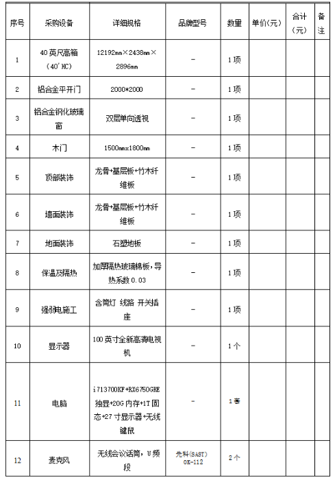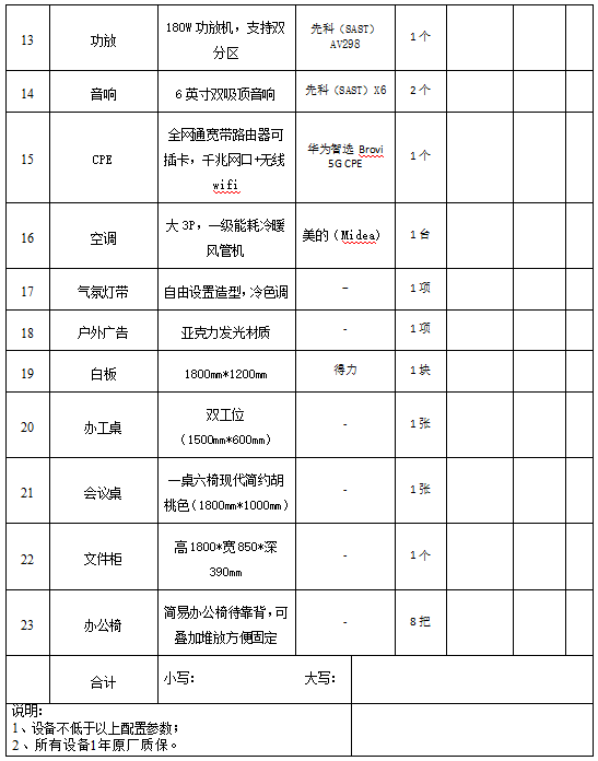 主要采购清单,技术规格等主要参数。