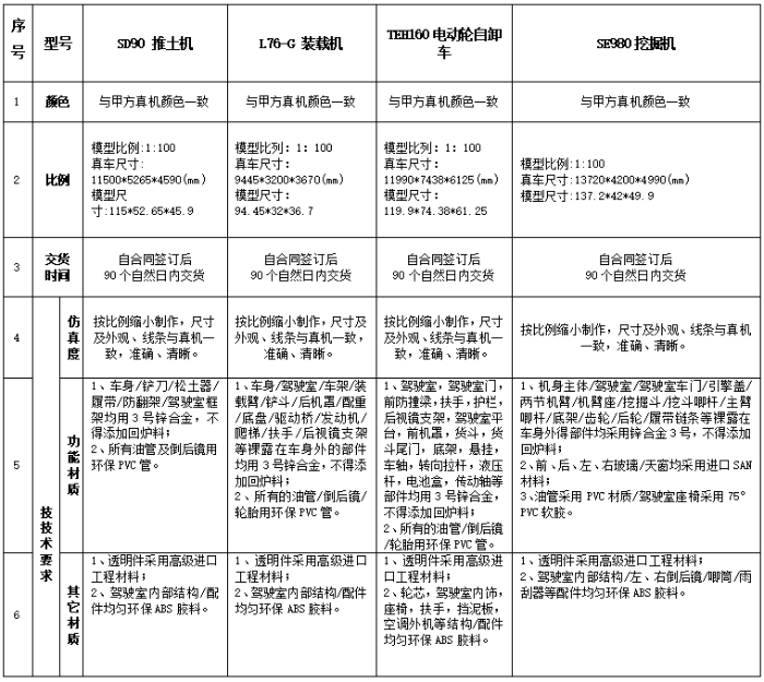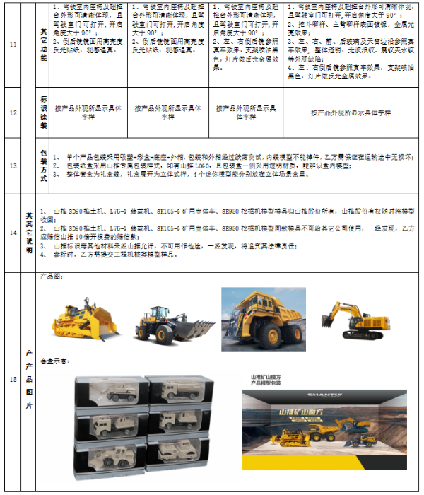 6、 项目概况:为进一步提升公司文创产品质量,提高品牌形象,促进品牌传播,提升客情关系,采购山推文创迷你模型套盒(共4款产品,SD90 推土机、L76-G 装载机、SE980挖掘机、TEH160电动轮自卸车,此4款产品无模具,需重新开模),模型比例:1:100。