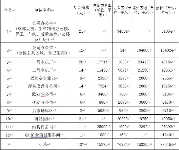 公司各单位保洁人员需求及范围汇总表
