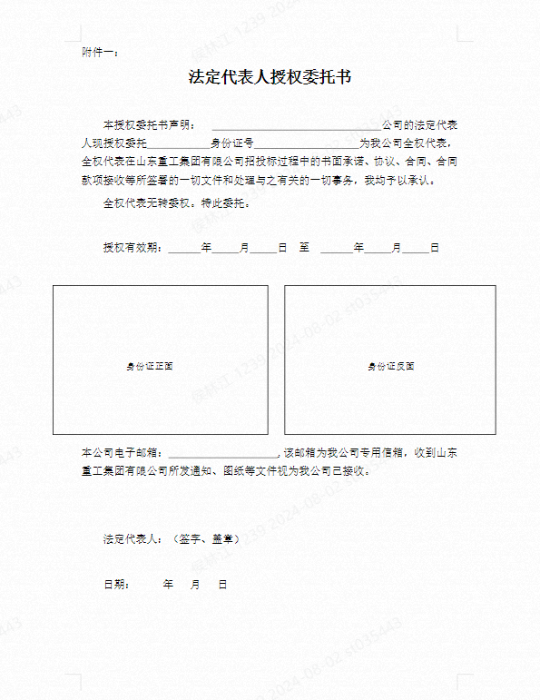 邮件名格式为:2024山东重工全闪存储设备框架-xx公司(五个字以内公司简称)-报名资料。同时必须在邮件中以文字方式提供投标单位全称、投标授权人姓名、联系方式(固定电话、手机、电子邮箱)。资格证明材料(所有资质证明文件均需加盖法人单位公章):