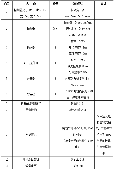 6. 项目概况:将现有旧设备进行折旧回收,在原有的设备位置更新一台双工位悬链步进式抛丸机,附带链轨节抛丸工装(可通用轮体抛丸)两套,履带板抛丸工装两套,并加装辅助起重装置,配置抛丸除尘系统及设备设施;同时需完成设计、运输、安装调试、人员培训、设备验收、交付使用和满足需方的工艺使用要求等一切事项。新设备安装在锻造车间原有抛丸机的位置,设计要求充分考虑设备位置布局,包含物料的物流运输通道。