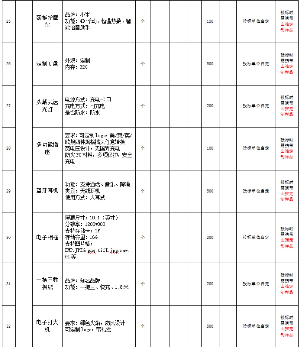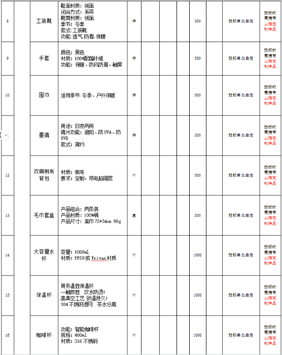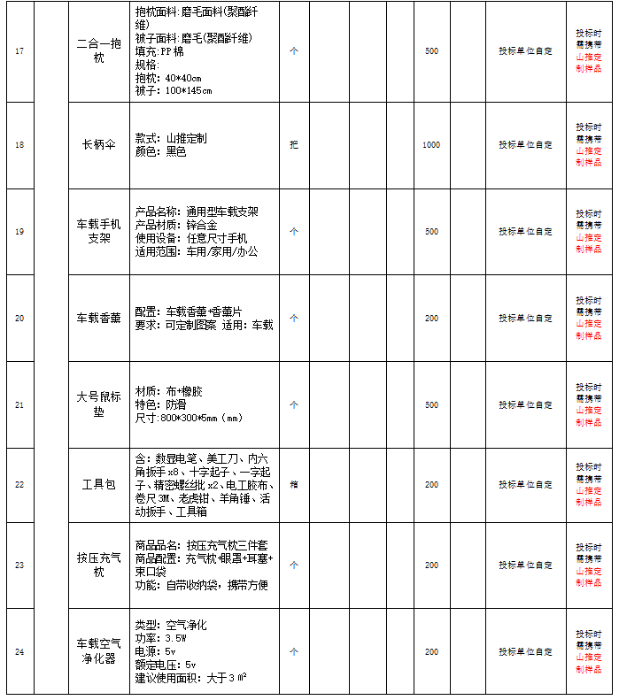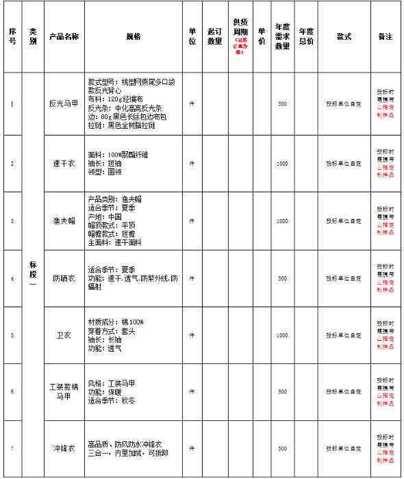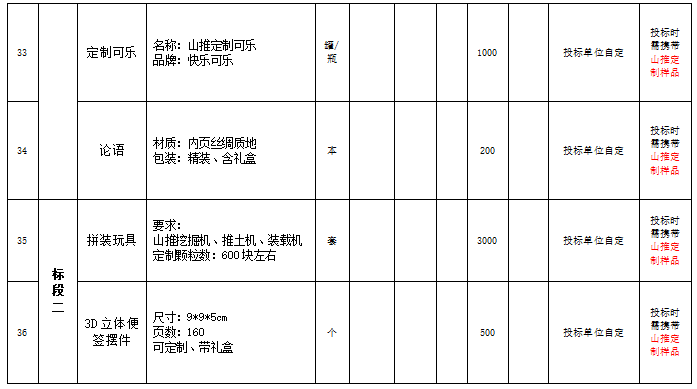 7、 项目说明:现以公开招标的方式,对山推文创产品的种类、规格、价格等进行明确,并确定1-2家战略合作企业,作为未来2年合作服务单位。本次投标采取分包中标的形式,根据品类分为2个标段,可分别报名,分别确定供应商。预计采购明细如下(以实际采购批次、批量为准):