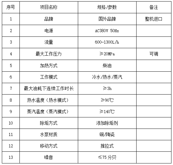 5. 项目概况:购买一台高压清洗机, 用于新产品装机试车后及整改车辆验证后的表面油污灰尘、底盘泥垢等污物清洗,高压清洗机规格参数要求如下