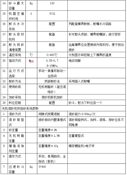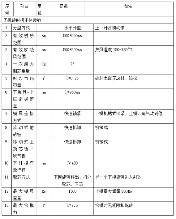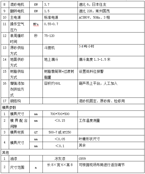 6. 项目概况:首先制作分瓣的砂芯,在砂芯表面预留定位装置及粘接槽,在二次射砂过程时用砂填充粘接槽,然新增项目后通过加热使砂芯固化,从而实现整体制芯。1)整机:包括供砂装置、混砂机构、下型升降夹紧机构、射砂机构、吹热空气机构、砂型脱模机项目编号构、模具移出及更换机构组成,可实现射砂、自动清理模具等功能,确保砂芯强度和表面完整性。(2)模具:配备一套射芯和组合制芯模具,模具叶栅型腔采用整体式。(3)砂芯:制作的砂芯表面无可见的缺材、缩松、磨损、多肉、裂纹等质量问题,单个砂芯与设计图误差控制在0.1mm内,组合有砂芯与设计图误差控制在0.2mm。组合后砂芯强度大于1MPa,整体砂芯使用过程不能出现散开、表面缺材、多肉、裂纹等质量问题。砂芯成品率在95%以上。砂芯在现场存放时间不低于10天,且砂芯强度大于1MPa。(4)封闭罩:为将生产过程产生的粉尘集中收集,采用2mm厚Q235制作射芯机罩,将整个射芯机封闭起来(5)安全光栅:在可进入设备内所有位置安装安全光栅,将其接入PLC控制程序中。
