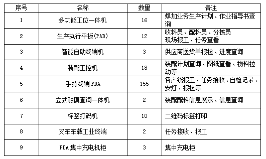 满足一号主机厂MES项目现场操作需要,需采购部分终端硬件设备,满足五条产线、仓库等生产区域生产任务查看、产线派工、生产报工、作业指导、自检记录、物料配送、物料接收、异常安灯等业务操作。