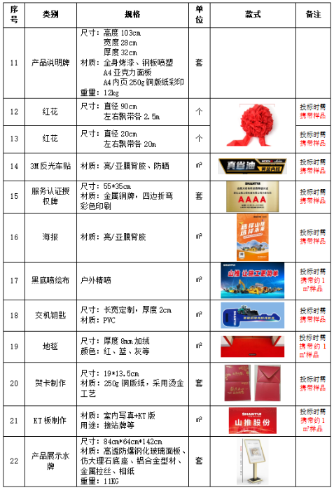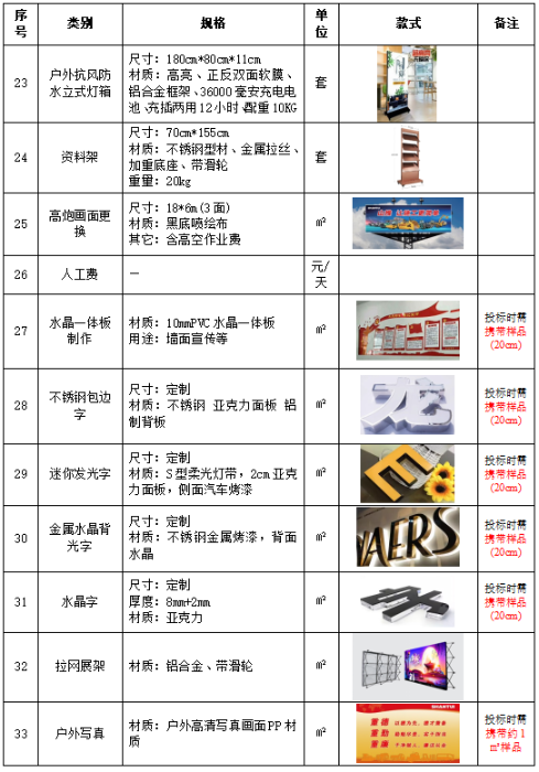 6、 项目概况:为进一步提升品牌形象,促进品牌及文化传播,服务一线销售及开展本埠工作,现以公开招标的方式,对年度广告宣传物料制作服务采购项目进行公开招标。并以此为准选取2-3家战略合作企业作为未来1年合作服务单位。主要采购清单,技术规格等主要参数见下表。