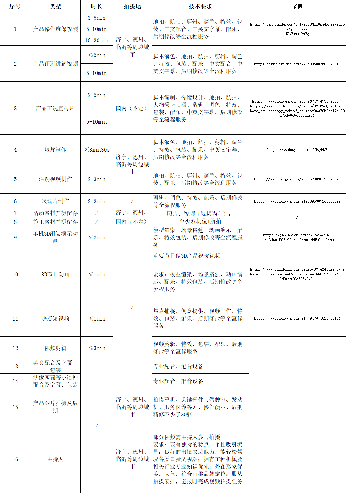 本次招标战略合作项目包含山推工程机械股份有限公司多种视频的制作,如企业宣传、产品宣传、活动宣传、形象宣传等。为推广山推产品,展现山推实力,增强品牌专业形象,拟采用公开招标的方式,确定2-3家中标服务商承担山推股份自合同签订之日起1年内视频制作业务,满足相关业务开展需要。主要项目及技术要求如下: