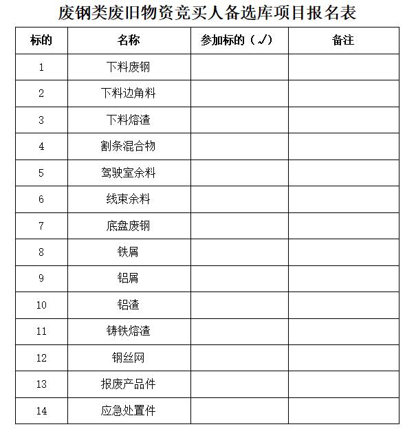 ⑬ 废钢类废旧物资竞买人备选库项目报名表