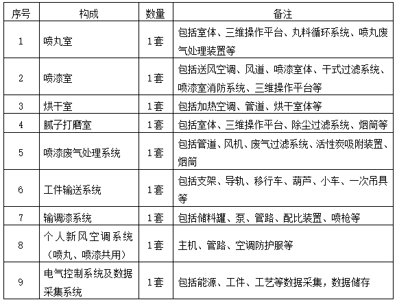 6. 项目概况:新建一条零部件涂装线,包括人工喷丸室、腻子打磨室、喷漆室、烘干室、喷漆废气处理系统、工件输送系统、电气控制系统、输调漆系统、个人新风空调系统等项目采用交钥匙工程,包括整条线的计算、设计、制造、包装、运输、现场安装调试、培训、陪产、第三方环保验收、售后服务、全过程项目管理等工作,最终交付能够实现稳定运行