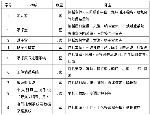 6. 项目概况:新建一条零部件涂装线,包括人工喷丸室、腻子打磨室、喷漆室、烘干室、喷漆废气处理系统、工件输送系统、电气控制系统、输调漆系统、个人新风空调系统等项目采用交钥匙工程,包括整条线的计算、设计、制造、包装、运输、现场安装调试、培训、陪产、第三方环保验收、售后服务、全过程项目管理等工作,最终交付能够实现稳定运行
