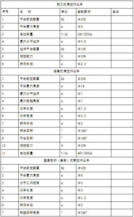 6. 项目概况:2025年拟在工艺管理部1#车间投资六台高空作业车,其中二台剪叉式高空作业车,一台曲臂式高空作业车,三台垂直桅杆(套筒)式高空作业车。主要技术参数如表1所示。 投标方需按招标方提供的技术要求,完成设备设计、制造、包装、运输、现场培训、设备验收、交付使用、后期服务等交钥匙工程的一切事项。
