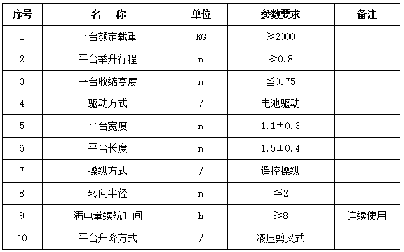 6. 项目概况:2025年拟在工艺管理部1#车间投资一台升降平台车,用于机械部件的承载、搬运、举升等作业,主要技术参数如表1所示。投标方需按招标方提供的技术要求,完成设备设计、制造、包装、运输、现场培训、设备验收、交付使用、后期服务等交钥匙工程的一切事项。