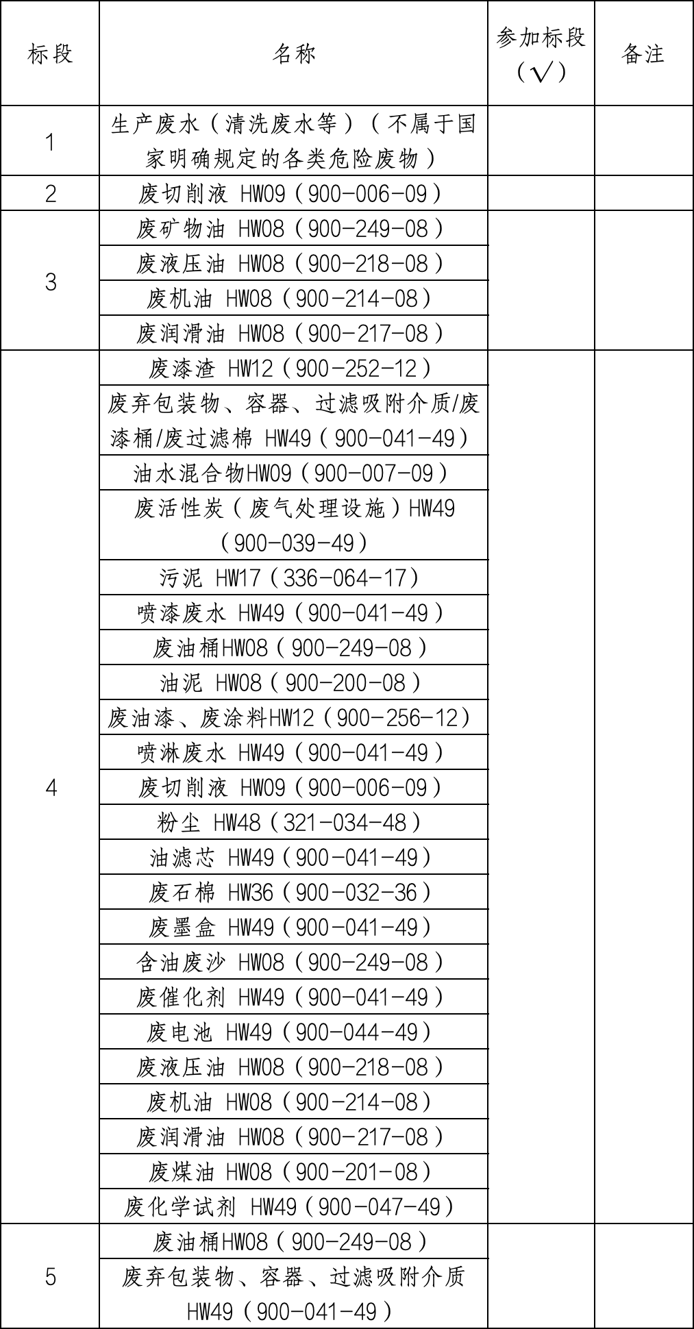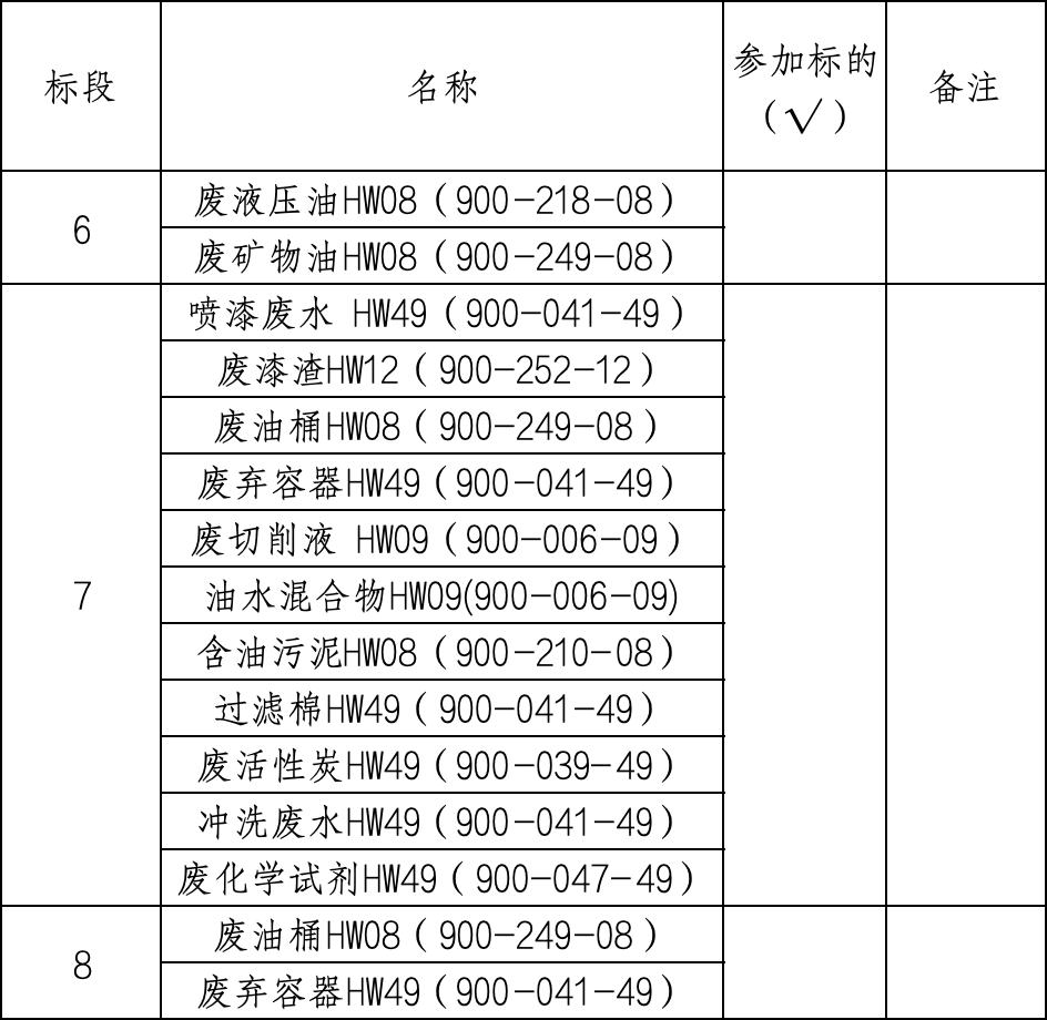 3. 经营范围满足招标项目需求。标段一:投标方营业执照经营范围应包含“污水处理”、排污许可证行业类别包含“污水处理”;标段二:投标方营业执照经营范围应包含“危险废物经营”、“危险废物的收集、贮存”、“危险废物的收集、贮存、利用”或“危险废物的收集、贮存、处置”等,危险废物经营许可证核准经营方式非“收集、贮存”有限资质,危险废物经营许可证核准经营危险废物类别包含以下危废代码:“HW09(900-006-09)”;标段三、标段六:投标方营业执照经营范围应包含“危险废物经营”、“危险废物的收集、贮存、利用”或“废油加工、回收等,危险废物经营许可证核准经营方式非“收集、贮存”有限资质,危险废物经营许可证核准经营危险废物类别包含以下危废代码:“HW08(900-249-08)、HW08(900-218-08)、HW08(900-217-08)、HW08(900-214-08)”;标段四:投标方营业执照经营范围应包含“危险废物经营”、“危险废物的收集、贮存”、“危险废物的收集、贮存、利用”或“危险废物的收集、贮存、处置”等,危险废物经营许可证核准经营方式非“收集、贮存”有限资质。危险废物经营许可证核准经营危险废物类别包含以下危废代码:“HW12(900-252-12)、HW49(900-039-49)、HW08(900-200-08)、HW17(336-064-17)、HW49(900-041-49)、HW36(900-032-36)、HW49(900-047-49)、HW08(900-249-08)、HW09(900-006-09)、HW09(900-007-09)、HW48(321-034-48)、HW49(900-044-49)、HW08(900-201-08)、HW08(900-218-08)、HW08(900-217-08)、HW08(900-214-08)、HW12(900-256-12)”;标段五、标段八:投标方营业执照经营范围应包含“危险废物经营”、“危险废物的收集、贮存”、“危险废物的收集、贮存、利用”或“危险废物的收集、贮存、处置”等,危险废物经营许可证核准经营方式非“收集、贮存”有限资质。危险废物经营许可证核准经营危险废物类别包含以下危废代码:“HW08(900-249-08)、HW49(900-041-49)”;标段七:投标方营业执照经营范围应包含“危险废物经营”、“危险废物的收集、贮存、利用”或“危险废物的收集、贮存、处置”等,危险废物经营许可证核准经营方式非“收集、贮存”有限资质。危险废物经营许可证核准经营危险废物类别包含以下危废代码:“HW09(900-006-09)、HW08(900-210-08)、HW08(900-249-08)、HW12(900-252-12)、HW49(900-041-49)、HW49(900-039-49)、HW36(900-032-36)、HW49(900-047-49)”。投标方危险废物经营许可证处于有效期。投标人注册资本不得少于人民币 200 万元。