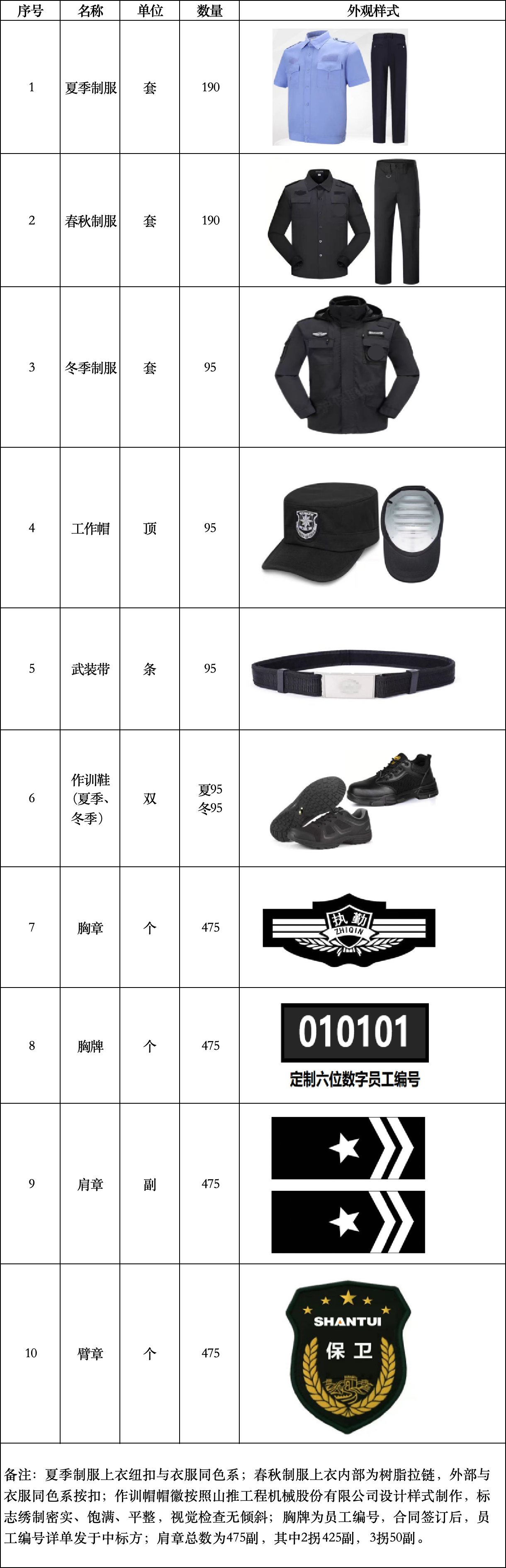 6、 项目概况:为提升保卫人员值勤形象,提高履职能力和服务水平,根据保卫工作性质,采购夏季制服、春秋制服、冬季制服、工作帽、武装带、作训鞋及相关配饰等。