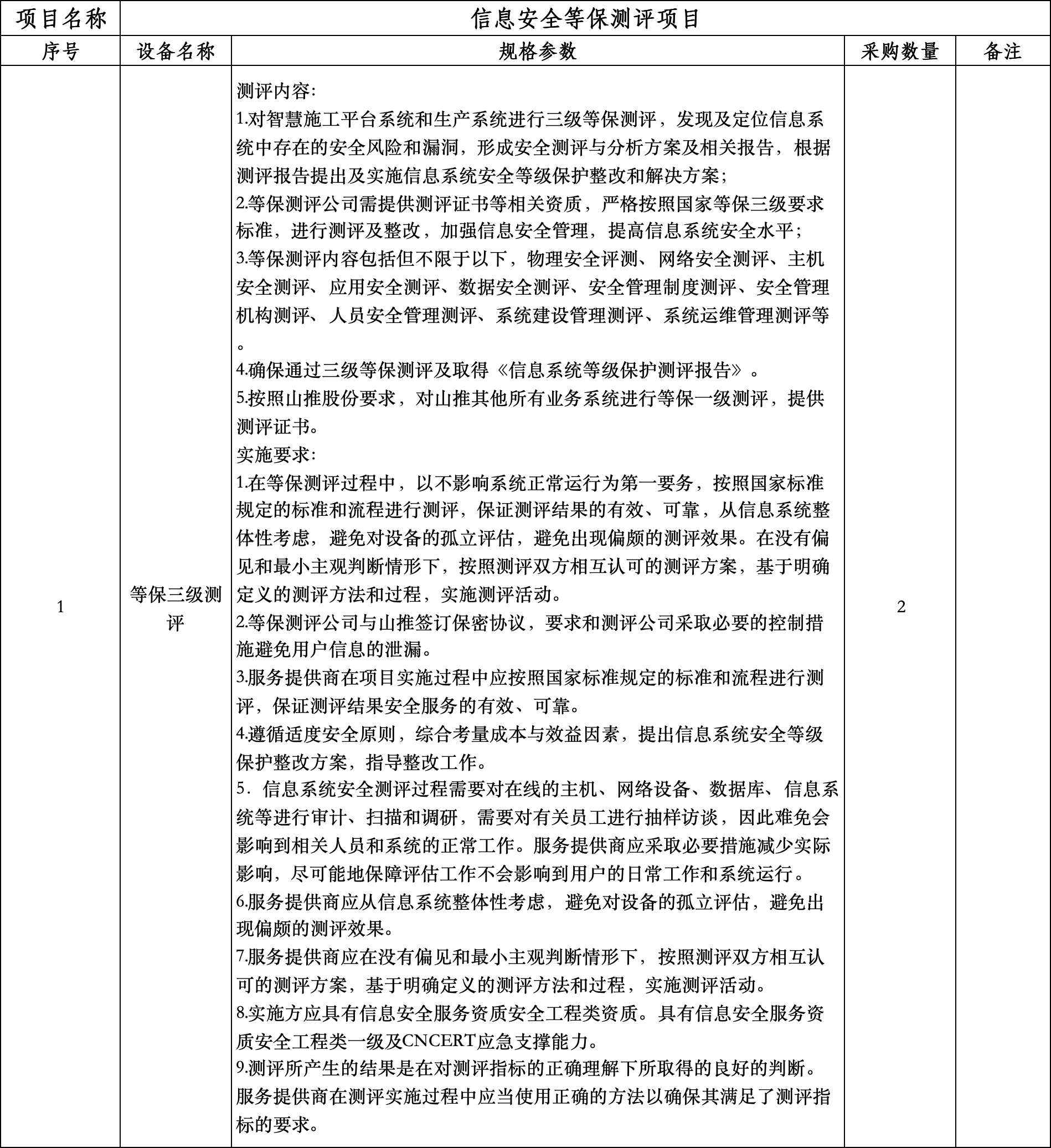 1、 项目名称:信息安全等保测评项目