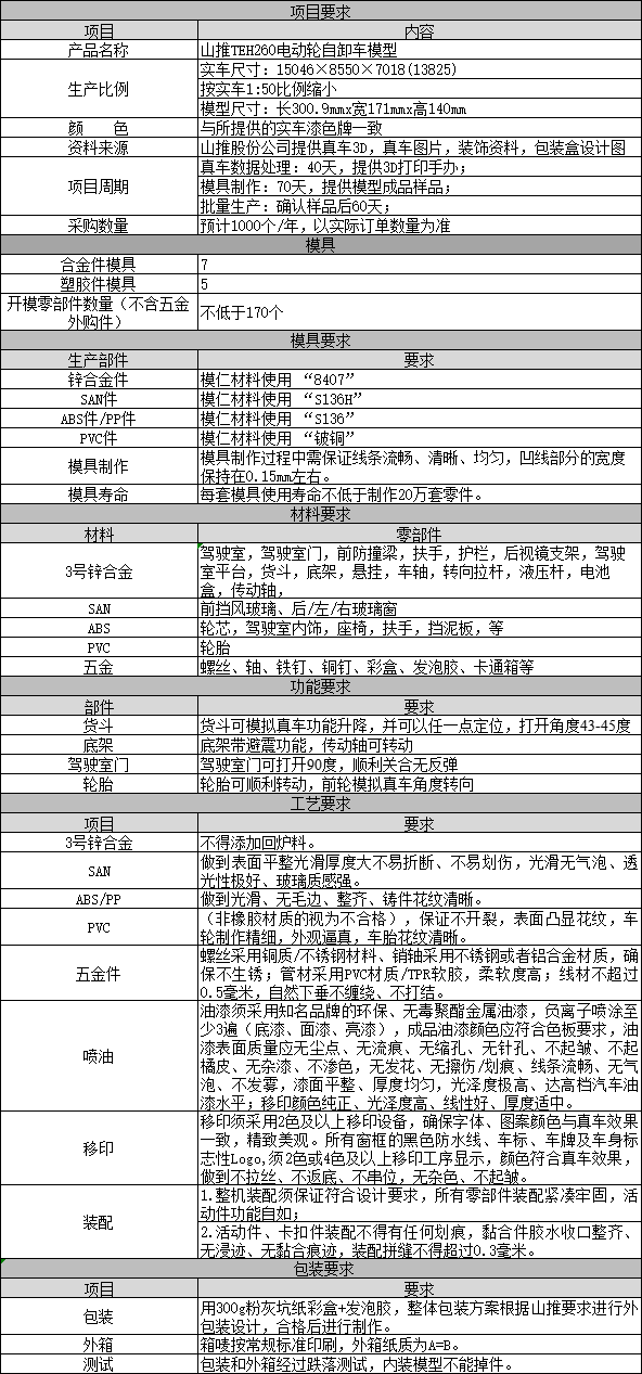山推工程机械股份有限公司(以下简称“山推股份”),为深入贯彻落实公司发展战略,进一步提升公司品牌形象,增强文创产品的市场竞争力,满足公司业务拓展的战略需求,山推股份公司现计划开发具有代表性的矿卡合金模型:1:50的TEH260电动轮自卸车合金模型。拟以公开招标的方式,对山推TEH260电动轮自卸车合金模型定制价格体系进行确定(TEH260电动轮自卸车无模具,需开模),并以此为准选取未来两年山推合金模型授权供应商。