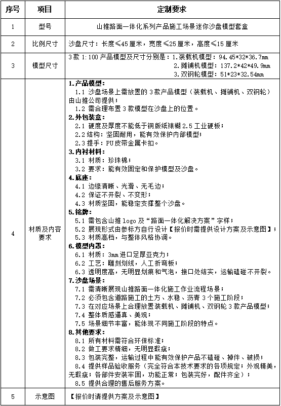 1、 项目名称:山推路面一体化系列产品施工场景迷你沙盘模型套盒定制采购项目