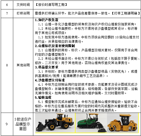 (3)响应时间:对于需要紧急制作的山推路面一体化沙盘模型相关产品,中标单位应该在规定时间内完成制作并送到山推工程机械股份有限公司。