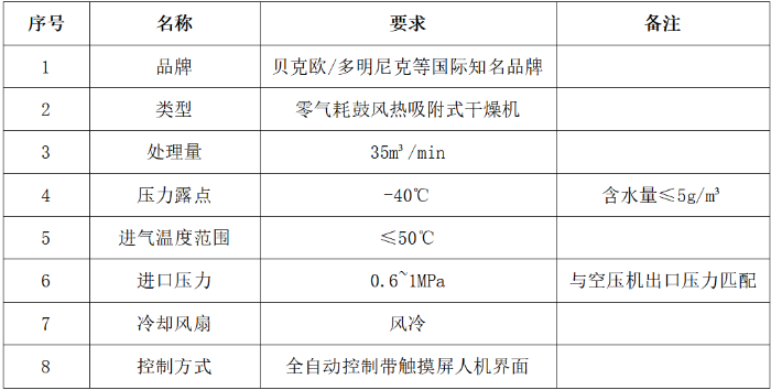 6. 项目概况:二号主机厂空压机房项目,增加空压机智慧管控系统,冷干机、储气罐、管道更新,冷干机更新,具体参数如下表: