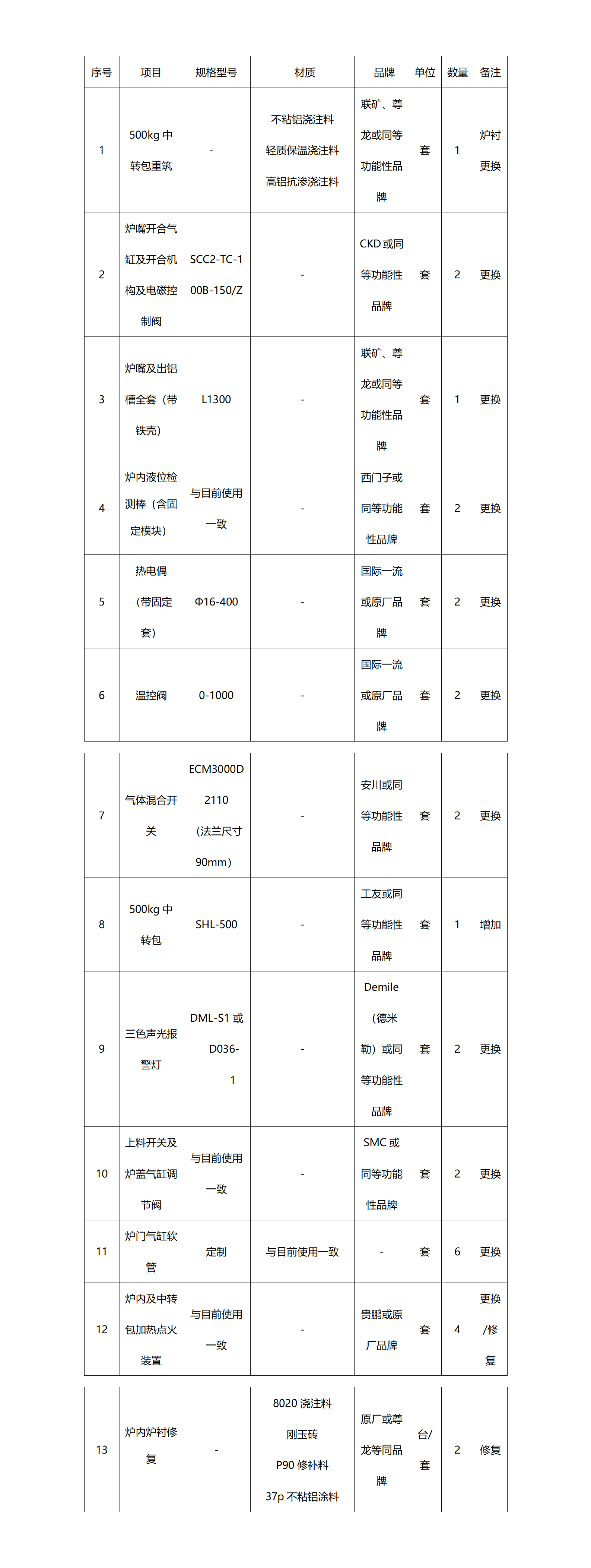 6. 项目概况:铝合金熔化炉、中转包加热装置及中转包设备维修项目,更换明细表