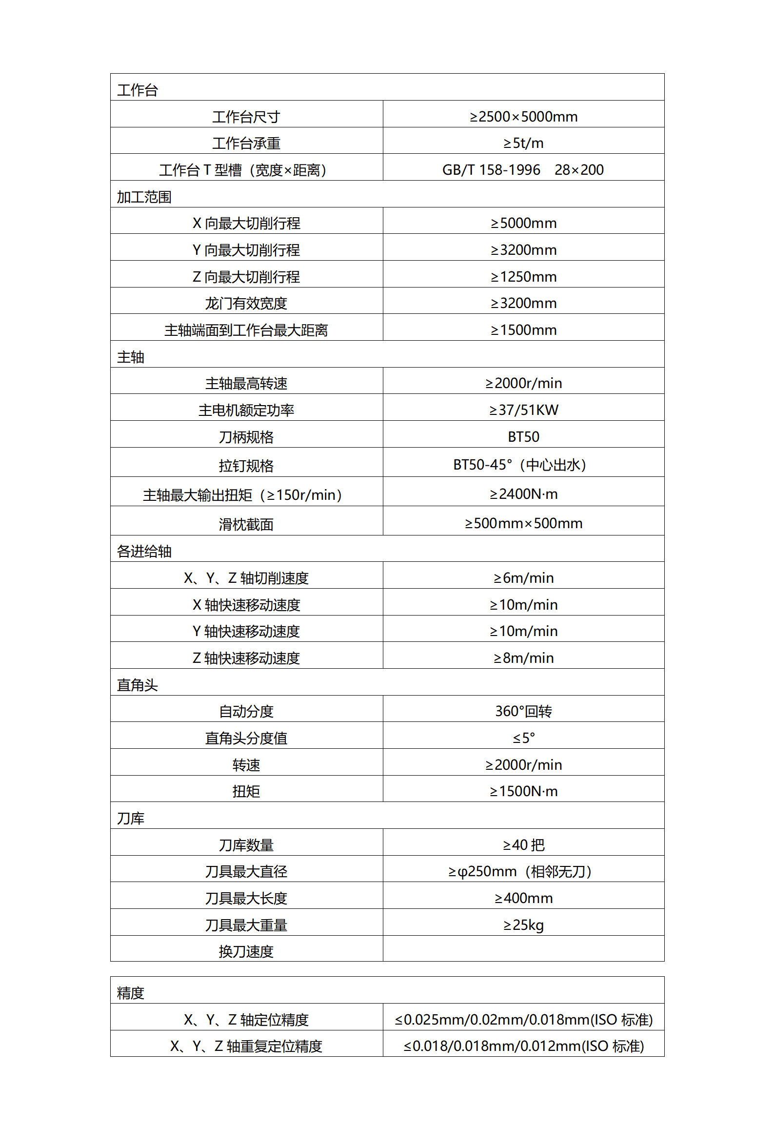 6. 项目概况:本项目包含数控龙门铣2台,采用龙门框架固定,工作台移动结构,用于工件的粗加工(要求机床刚性好,单次加工深度4-8mm),包含直角头1套,工装2套,工装可满足液力推土机台车架上面铣削、钻攻螺纹孔加工。主要技术参数