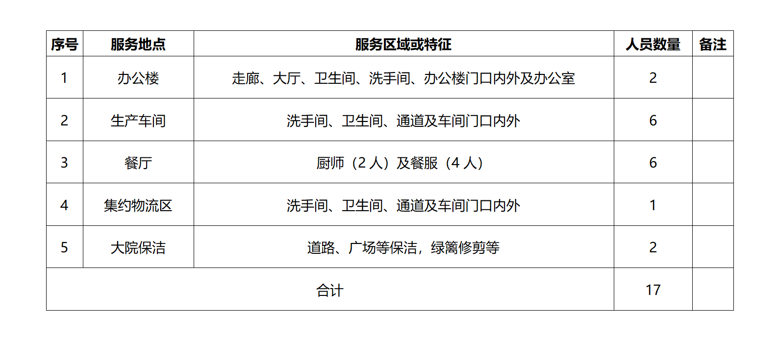 负责办公楼和车间的通道、办公室、卫生间、洗手间及餐厅保洁服务等,具体见下表: