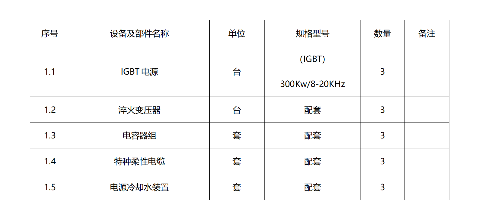 6. 项目概况:山推工程机械股份有限公司履带底盘分公司,对3台套外周淬火机床进行热处理电源改造。中标方负责数字电源与招标方动力柜、设备的接口连接,招标方提供电源板换冷却水源,中标方负责连接至电源冷却水装置,感应器招标方自备。数字化电源采购清单