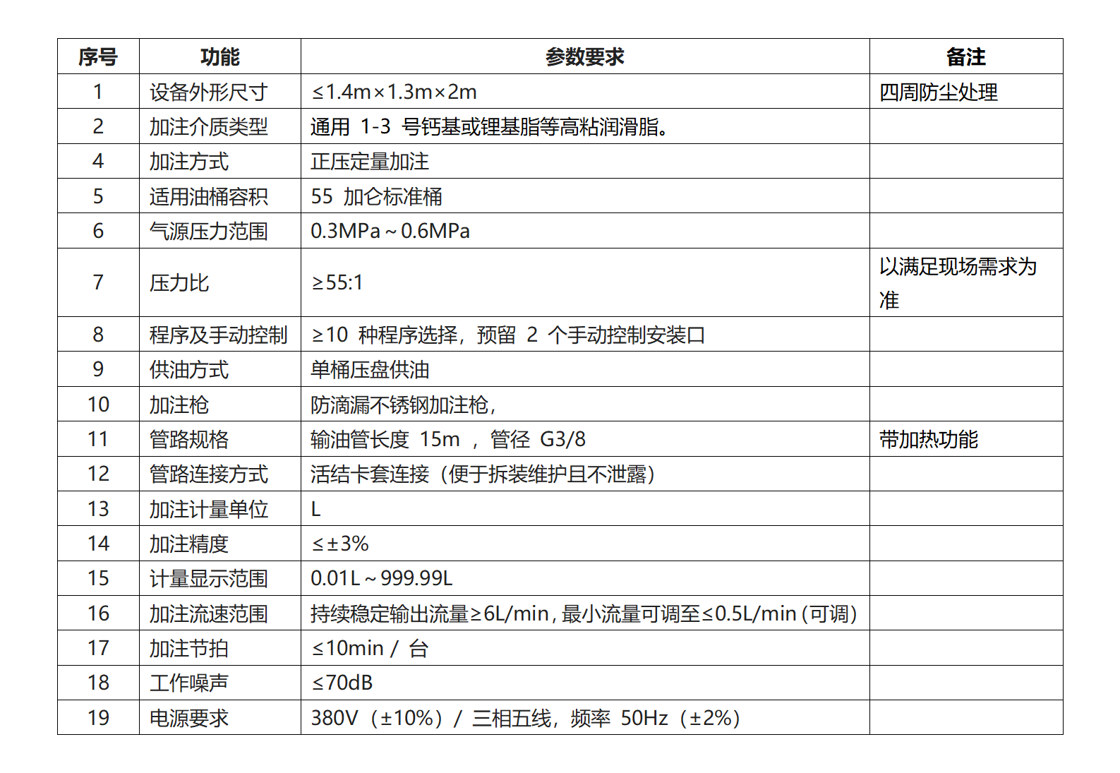 6. 项目概况:新增一台黄油定量加注机,保证加注质量,加注机具有自加热功能,可四季统一使用3# 黄油;带有防滴漏装置,保证不工作时无黄油滴漏,保证现场5S合格;可满足不同车型的不同加注量需求,加注程序可通过选择按钮或扫描整机码直接选择。技术参数如下