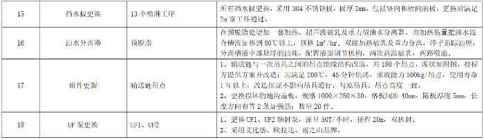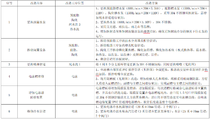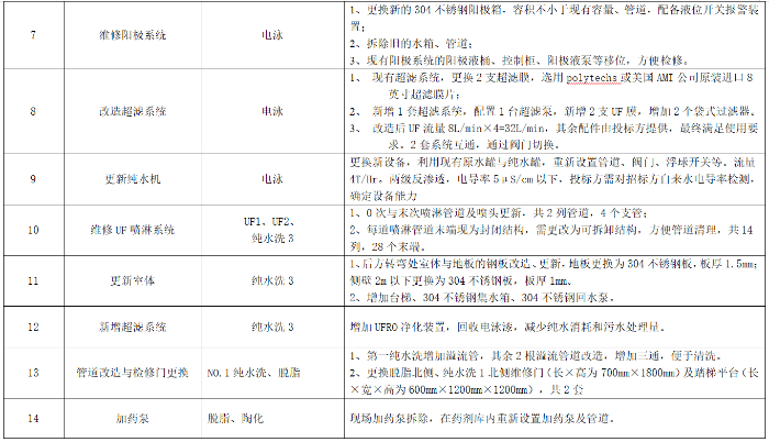 6. 项目概况:提升电泳漆利用率,对电泳线进行项修及改造。主要内容:室体部分更新、喷淋管道更新、水泵更新、纯水设备更新、超滤系统改造、阳极液循环系统更新,链条驱动装置调整位置。本项目为交钥匙工程,中标方应负责项目的设计、制造、运输、安装、调试、培训、陪产、交验、质量保证及售后服务等工作。维修内容