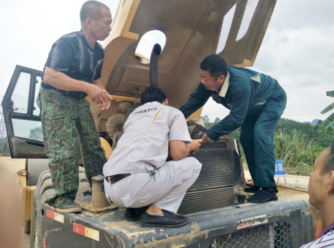 在柳州某地土地平整的现场,多台山推设备参与作业。利用中午休息时间,山推服务工程师为推土机、压路机进行免费检查,和操作手交流日常注意事项。