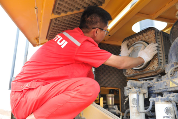 正在此地施工的赢昊公司拥有8台山推设备,看到山推服务团队一行人到来,管理设备的秦经理热情地迎了上来,然而服务工程师们并没有因为客户的热情放松下来,寒暄过后就直奔设备开始保养工作。看着一行人忙碌的身影,秦经理感慨颇多:“山推设备出勤率高、故障率低、使用成本低、服务及时、到位,真的就像那句口号说的一样,让施工更简单。”