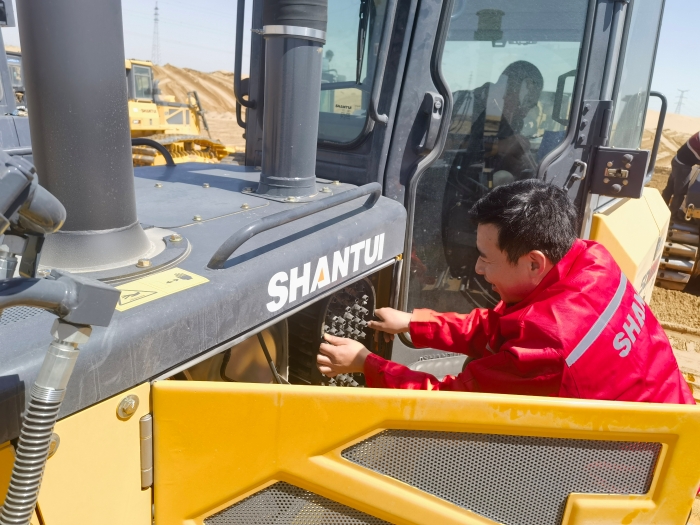 大漠高温即将来临,山推服务团队“快”速响应,与项目施工单位接洽,对高温天气下出现的设备问题要做到“准”确预判,为保证设备性能“稳”定性,山推用“狠”严格的服务要求,对所有设备排查、检修层层把控,为客户的百余辆设备进行了入夏前的设备检查,多遍查看空调制冷效果,并对散热器进行了重点检测,确保客户在夏季到来时能有一个非常舒适的驾驶环境。用最专业的服务技能做到精益求精,让客户用车无忧、终生无忧。