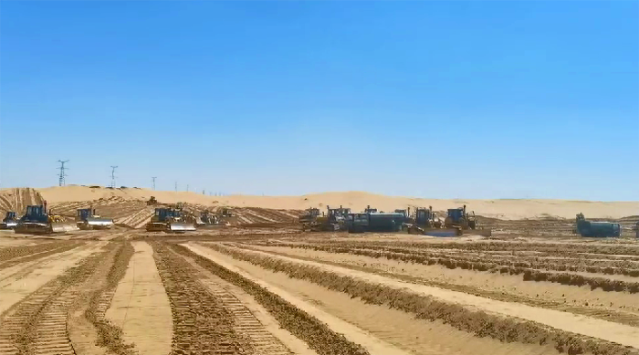 近年来,随着可持续战略成为中国建设发展的主旋律,全国范围内一大批新能源重大项目密集开工,作为“国之重器”的山推,自然不会缺席这场新时代建设伟业。此次走访的新能源基地项目先导工程,共有山推SD17T及SD16设备70余台,加之前期购买设备参与沙漠治理、光伏项目建设,总量高达百余台。在库布其沙漠鄂尔多斯中北部新能源基地先导工程“标准地”建设现场,轰隆隆的机械声不绝于耳,上百辆山推推土机来回穿梭,井然有序地进行着场地平整作业,用完美强劲的动力为这片土地带来前所未有的喧嚣生机。