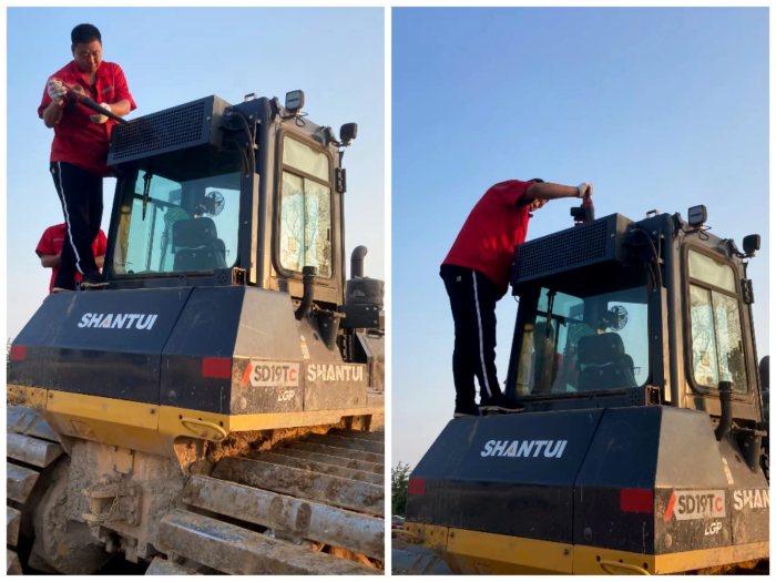 随后,服务人员登上履带,挽起裤腿,在空调散热器部位进行了重点的检测,对线束进行仔细排查,确保散热器的稳定。手持吹风机,将驾驶室顶层的空调散热器一点点的吹去有可能堵塞的脏污。进入驾驶室内亲自体验检查后的制冷效果。此次检查为客户降低驾驶室内温度达4度左右,提前让客户感受到了缕缕清凉