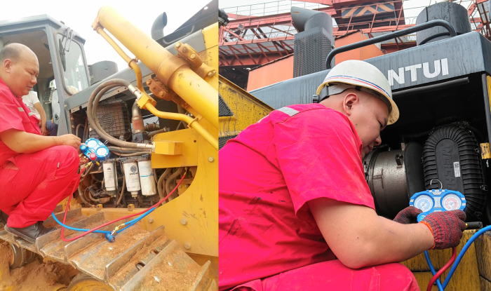 关爱服务小组人员顾不得午后的烈阳,登上设备为客户做空调各部位的检查,从空滤除尘、空调系统压力检查加氟、散热器灰尘清理、设备全方位健康检查等,每一项工作进行得有条不紊、细致入微。不到半小时的功夫,后背却已被汗水浸湿。每次给客户检查线速时,都能看到服务师傅们在裤子上多次抹去手上汗水的情景。专业的服务态度与精湛的服务技能,让客户更加直观的感受到了推服务的金字招牌。