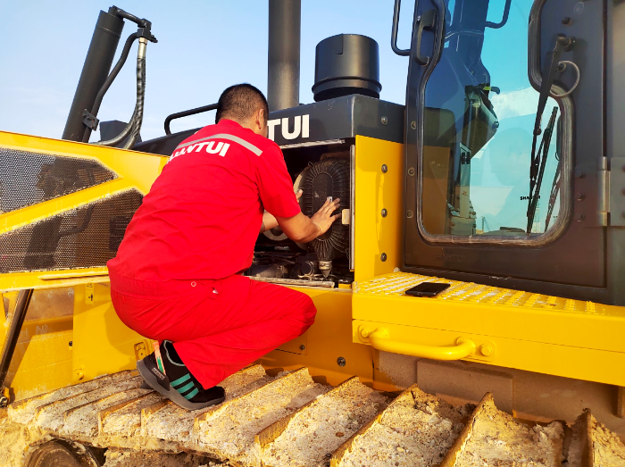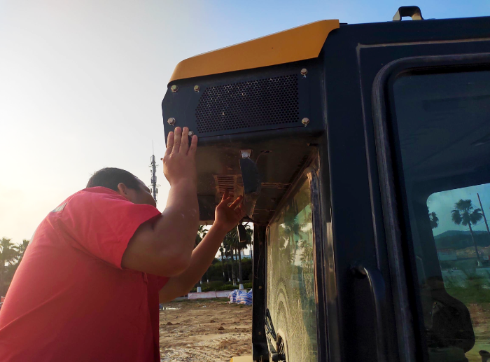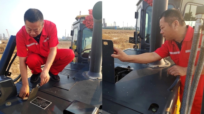 夏日炎炎,关爱小组人员迎接高温挑战,现场为设备进行全面检修,保障设备快速散热、稳定运行的同时为驾驶员提供舒适的驾驶环境。服务人员不惧阳光的照射,多次在驾驶室内外仔细的查看着空调入风口有无异物阻塞、空调氟利昂是否充足,并且在正午阳光最强的时间进入驾驶室内部,用温度计测量准确的室内温度,查找相关制冷原因。经验丰富的冯老师则是到推土机的外部细心的查看着空调散热器的散热情况。防止凉风循环不通畅,导致无法快速散热。