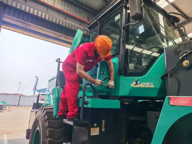 作为此次客户关爱行活动的重要一站,山推服务团队顶着盛夏酷暑,率先奔赴山东区域某港口,为客户的6台LE60-X5电装整机提供全方位检修服务。抵达现场后,服务人员迅速投入工作。针对港口作业环境的特点,团队制定了精细化服务方案:首先对6台整机开展全车点检,重点检查核心组件的运行状态,细致排查螺栓紧固度,确保设备关键部位无隐患。