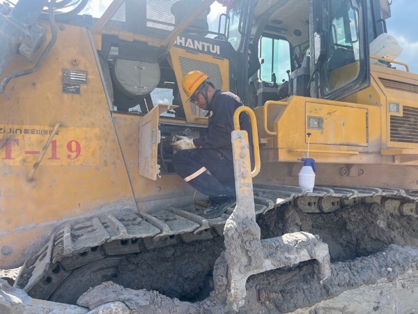 福建山推客户关爱行走访团队深入福建龙岩紫金山金铜矿山顶作业区,对紫金矿业集团正在服役的2台DH46-G推土机展开专项走访和深度维护。服务工程师身着山推工装的身影正迎着烈日与尘土,专注的为两台DH46-G“把脉问诊”。他们以精湛的技术、坚韧的意志和赤诚的敬业精神,将“山推服务,用车无忧”传递到山巅矿区作业现场,赢得了用户的高度赞誉。