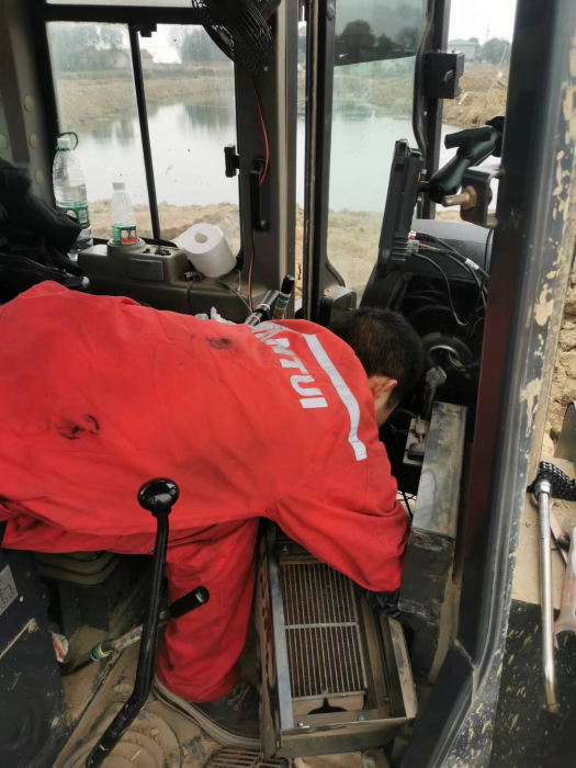泥巴裹满机身,已然分辨不出旧时的辉煌模样,却只能让服务人员深切感受到他为客户立下的赫赫战功,他用近万的小时数谱写着他的汗马功劳。服务人员深入泥泞的施工地点,再与客户简单的询问交流后,迅速进入驾驶室内部,开启故障排除模式。较为狭小的空间内,服务人员俯身数次将GPS硬件进行快速更换。并用智多星对客户的设备进行测试,不到半小时,客户的设备启动如初。客户微笑着说:“这手艺还是你们专业,比我预计的快了许多。”