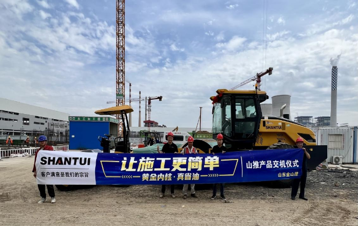 赶到第二个交付现场,服务工程师们的身体是疲惫的,但是他们的心情是愉悦而充实的,客户对于这两台压路机的交货服务非常满意,该项目负责人梁经理和咱们山推也是老相识了,对于山推品质给予了高度的评价,和我们的山推服务人打了多年的交道,他说:“来,大家一起合影,我也算是你们山推人了。”就这样在鞭炮齐鸣中、欢声笑语中,一天内完成了两个施工现场交货服务,今天的工作是完美的,今天的心情是兴奋的,而今天的山推服务人也是最美的。