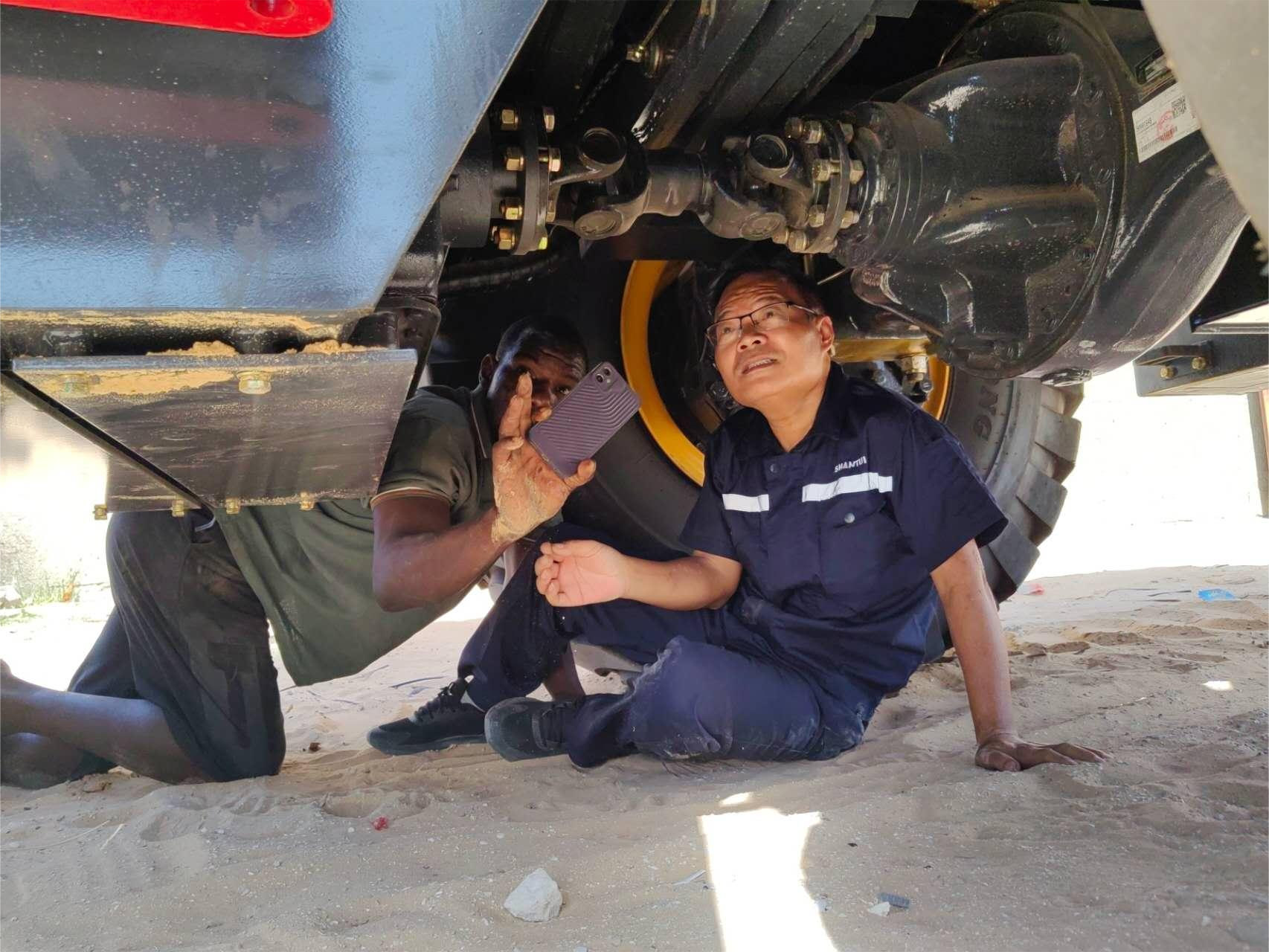 联轴器是否有异常磨损,是否是缺少润滑脂导致,这一项项专业的查看都被他认认真真的一点一点的进行着。旁边的机手这时也主动的帮刘文静用手机灯进行辅助查看。不过半小时的时间,他便查找到了病因,并进行了快速修复。受当地热带气候的影响,刘文静虽然只用了不到一小时就将故障排除,但是正午的高温却在悄无声息的节节攀升,已经是临近40℃了,此时他的工装早已被汗水打湿,形成了片片白色的碱花。刘文静从车底钻出来,用最简便易懂的语言向客户交流如何避免故障的发生。这让机手不仅亲身感受到了海外服务人员的精湛技能外,还深切的体会到了他们认真负责的态度。机手树立起的大拇指也同样传递给刘文静他的信任与感谢。