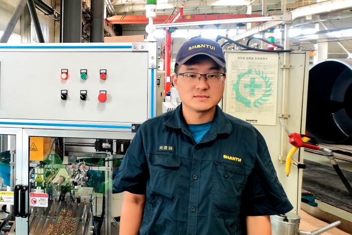 压路机十字铰装配时需要人工测量多处尺寸同时要进行试装调整,人工测量易出错,劳动强度大。他提出并推进了十字铰智能选垫设备应用,将原人工压装、测量、试装改为自动压装、测量、选垫的自动化生产方式,解决了人工试装误差造成的十字铰异响问题,作业效率大大提升。