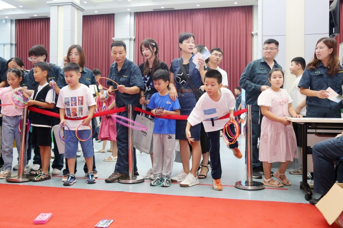 刚走过笑脸墙,孩子们就被远处的青蛙和兔子玩偶深深吸引了,飞快跑过去,与玩偶握手拍照做游戏。109会议室是为孩子们精心打造的快乐魔方,现场设置了快乐套圈、沙包投掷、趣味保龄球、幸运抽奖、打卡拍照、美味甜品、小丑互动等七大区域,并为孩子们准备了工程机械玩具、精美笔记本、台灯、存钱罐、盲盒等丰厚的礼物,整个109充满了欢声笑语,场面异常火爆。活动现场,家属朋友们有的享受套圈、扔沙包、扔保龄球活动带来的快乐;有的在拍摄区体验沉浸式打卡的快感;有的在小丑互动区体验气球游戏的乐趣;有的在甜品区享受舌尖上的美食……丰富多彩的趣味活动,将现场氛围不断推向新的高潮,一家人齐心协力,默契配合,欢乐开怀。活动最后,家属们一起来到员工餐厅体验自助餐。