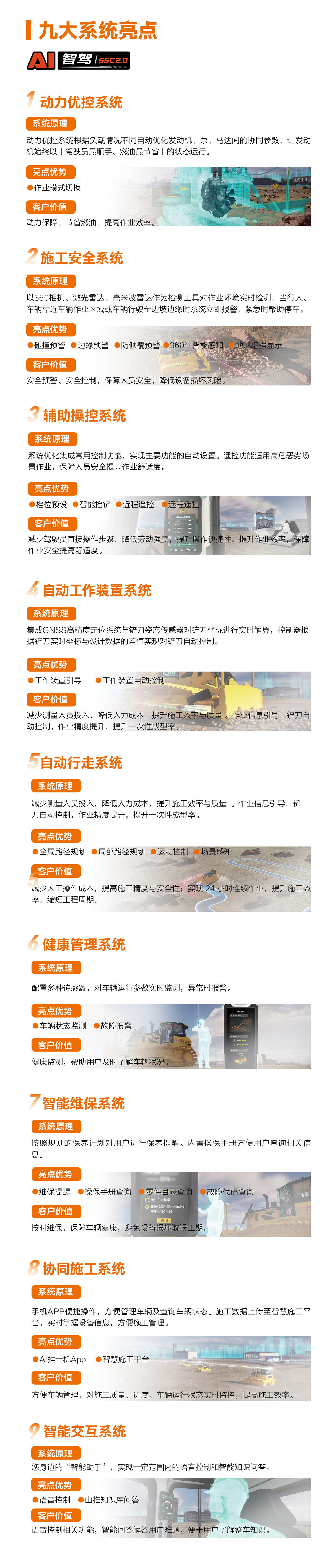 AI智驾:DH17-G 推土机,可基于山推SSC( SHANTUI Smart Constuction)技术平台实现AI升级,融合人工智能、大数据相关技术,构建 “感知 - 决策 - 执行” 全智能闭环,实现工况研判、路径动态优化、铲刀厘米级精控,以技术革新引领工程机械智能化跃迁,是行业从 “机械作业” 向 “智能决策” 跨越的典范之作。